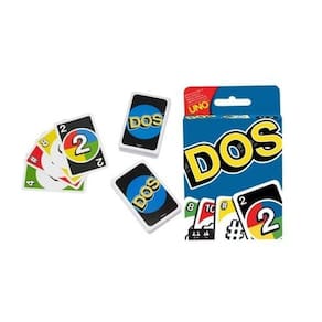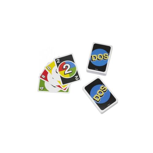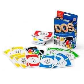 El Dos é um jogo de cartas da Mattel por pontos pensado para 2 a 4 jogadores, que consiste em 108 cartas. Ao contrário da ONU, seu “irmão maior” não tem cartas especiais, apenas números e comodidades. No entanto, as regras do DOS são tão fáceis de dominar quanto as da ONU, por isso a diversão é garantida.Cada carta tem uma cor: vermelho, amarelo, verde, azul e preto. Cada grupo de cores, exceto o preto, tem três cartas de 1, 3, 4 e 5, duas de 6, 7, 8, 9, 10 e duas características do DOS. Há também doze cartas de cor preta de 2.