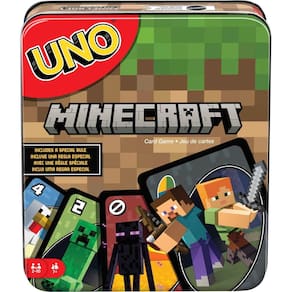 Mattel Games Jogo de cartas UNO Minecraft para noite em família com gráficos temáticos de Minecraft em uma lata colecionável para 2 a 10 jogadores (exclusivo da Amazon) - O clássico jogo de cartas UNO cria diversão na noite de jogo com um tema Minecraft. - O UNO Minecraft apresenta um deck e uma lata de armazenamento decorada com gráficos do popular videogame. - Os jogadores combinam cores e números com a carta no topo da pilha de descarte, como no jogo clássico. - A carta Creeper exclusiva deste baralho força outros jogadores a comprar 3 cartas. - É um ótimo presente para noites de jogos infantis, adolescentes, adultos e familiares com 2 a 10 jogadores a partir de 7 anos, especialmente fãs de Minecraft e videogame.