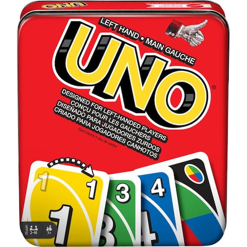 Jogo de cartas UNO da Mattel Games para noites em família com cartas especialmente projetadas para jogadores canhotos em caixa de lata colecionável - Southpaws será o primeiro a pegar Left Hand UNO, mas todos poderão jogar, canhotos ou destros. - Os números nas cartas de baralho foram movidos para o outro lado para que seja mais fácil para um canhoto se espalhar. - Os jogadores correm para se livrar de todas as suas cartas combinando uma carta em sua mão com a carta no topo da pilha de descarte, por cor ou número. - Cartas de ação como Skip, Reverse e Wild Draw Four ajudam a agitar a concorrência. - Quando as camadas estão reduzidas a uma carta, eles não podem esquecer de gritar “UNO”. - Armazenado em uma lata conveniente para viajar, o jogo de cartas é um ótimo presente para o canhoto favorito.