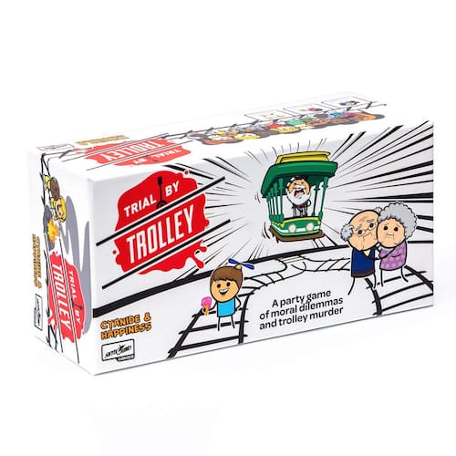 Skybound Trial by Trolley: um jogo de cartas adulto de dilemas morais e assassinato | Jogos de festa e cianeto e felicidade | 3-13 jogadores, a partir de 18 anos - Trial by Trolley é o mais recente jogo de festa da Cyanide & Happiness, as mesmas pessoas que arruinaram a Internet. - Você é o operador de um carrinho fora de controle e deve tomar decisões horríveis e indescritíveis sobre quem atropelar! - À esquerda: uma piscina infantil cheia de bebês. À direita: o cientista que um dia curará o câncer. Você precisa atropelar um deles. - 500 cartas de alta qualidade ajudarão você a construir dilemas éticos horríveis e forçar seus amigos a agirem de acordo com eles! Finalmente, um jogo de festa que pesa em sua consciência por dias. - No Reino Unido, o carrinho significa carrinho de compras, o que torna este jogo ainda mais louco, provavelmente.