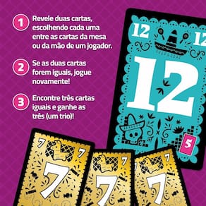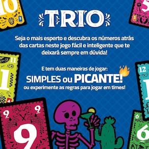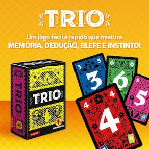 Em TRIO, revele cartas da mesa ou das mãos dos jogadores, procurando cartas idênticas para formar trios. Forme 3 trios e vença a partida! TRIO mistura vários elementos de maneira elegante: memória, dedução, blefe e instinto! Seja o mais esperto e descubra os números atrás das cartas neste jogo fácil e inteligente que te deixará sempre em dúvida! E para deixar suas partidas ainda melhores, TRIO inclui duas formas de jogar e regras para jogar em times!