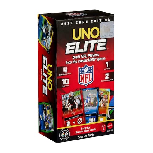 Experimente a emoção de um estádio com o jogo de cartas UNO Elite NFL 2025 Core Edition oficialmente licenciado! Comece a ação com 112 cartas especiais do pacote inicial e intensifique-a com 4 pacotes extras e 2 cartas promocionais. Cada pacote de reforço contém 10 cartas Elite Action, totalizando 40! Mantendo o estilo clássico do UNO, desfrute de novas ações como Skip and Reverse, com jogadores amados da NFL. Com mais de 2.000 cartas Elite Action disponíveis, melhore sua jogabilidade. Quando chegar à carta final, grite: “Hut, hut, UNO!”. Um presente indispensável para entusiastas de jogos de cartas e da NFL, adequado para maiores de 7 anos. As cores e as decorações podem variar.