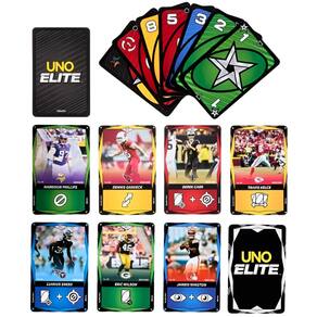 Descrição do produto : " Viva a emoção digna de um estádio com este jogo de cartas UNO Elite NFL 2025 – Core Edition, oficialmente licenciado! A ação começa com 112 cartas especiais do Starter Pack e esquenta com 4 pacotes extras e 2 cartas promocionais. Cada pacote booster inclui 10 cartas de Ação Elite, totalizando 40! A dinâmica segue o estilo do UNO clássico, mas com ações como Pular e Inverter, e com jogadores favoritos da NFL. São mais de 2.000 cartas de Ação Elite disponíveis para elevar o nível das partidas. E quando restar só uma carta, prepare-se para gritar: “Hut, hut, UNO!”. É um presente imperdível para fãs de jogos de cartas e da NFL, a partir dos 7 anos de idade. Cores e decorações podem variar. Escale jogadores da NFL em uma nova versão do clássico UNO, com o Starter Pack de UNO Elite NFL 2025 – Core Edition, oficialmente licenciado! O kit vem com 112 cartas especiais, 4 pacotes booster para expansão com 10 cartas de Ação Elite cada, além de 2 cartas promocionais! A dinâmica segue o estilo clássico do UNO, agora com toda a ação e adrenalina da NFL! Os jogadores só precisam jogar uma carta com o ícone Elite, da cor correspondente, para ativar uma poderosa carta de Ação Elite. E mais: algumas cartas são ainda mais especiais! Símbolos gráficos especiais foram adicionados às cartas para ajudar a identificar as cores, permitindo que pessoas com qualquer tipo de daltonismo possam jogar! Como parte da série UNO Elite, este jogo pode ser expandido com cartas Elite dos pacotes booster. Vendidos separadamente, sujeitos à disponibilidade. : " Detalhes técnicos : Marca: Mattel : Referência: JHG46 : Idade recomendada: 7 : Material: Papel cartão : Ean: 194735330966 : Peso (kg): 0,41 : Dimensões aproximadas da embalagem: 19 x 10 x 6 cm : Inclui: 112 cartas especiais, 4 pacotes booster com 40 cartas Elite, 2 cartas promocionais e instruções. Produto com oficial oficial. :