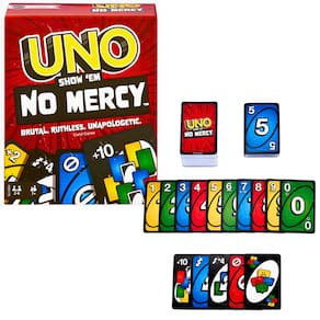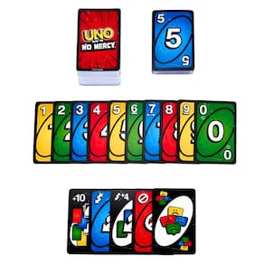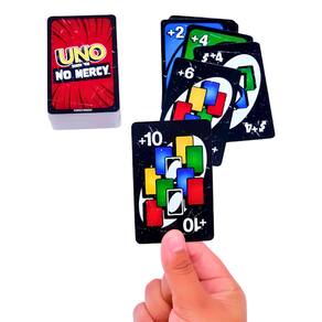 UNO Show 'em No Mercy é o nosso jogo UNO mais brutal até agora! Tem muito mais cartas com penalidades MUITO mais duras (sortear 10 cartas alguém?) e novas regras que terão jogadores empilhando, trocando e sacando mais cartas do que nunca! E há até uma Regra da Misericórdia (sim, temos a ironia) se as coisas ficarem muito difíceis. Há duas maneiras de ganhar nesta versão impiedosa do jogo clássico: livrar-se de todas as cartas OU derrubar todos os outros jogadores do jogo! Ah, e se você conseguir chegar a um cartão, não se esqueça de gritar "UNO!"