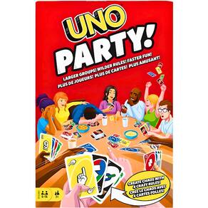 Vamos continuar a festa com o UNO Party! O jogo se inspira no modo clássico, mas com regras especiais projetadas para grupos grandes - de 6 a 16 jogadores! A regra especial "Ponto Obtido", faz com que todos os jogadores apontem para os outros jogadores e, em seguida, cada jogador deve comprar tantas cartas quantos dedos estiverem apontando para ele! A regra especial "Comprar Juntos", une dois jogadores que devem comprar cartas ao mesmo tempo. O Jogo Rápido permite que os jogadores joguem uma carta fora do turno, se forem rápidos o suficiente! A carta Rastreador de Direção ajuda a manter o controle da direção do jogo.