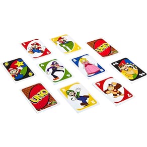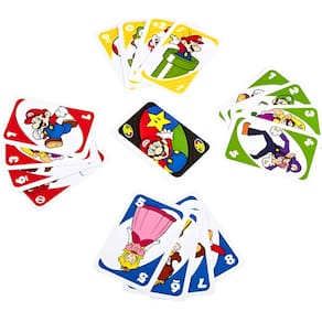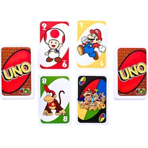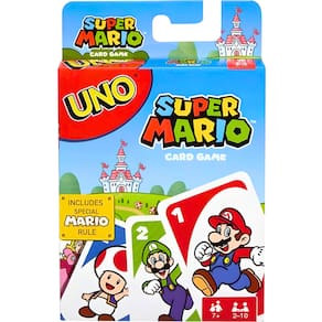 Junte-se a Mario, Luigi e todos os seus amigos para um jogo especial de UNO! É o clássico UNO que você adora, mas esta versão também inclui um Mario Super Star Card especial que torna seu personagem invencível! Depois que outro jogador joga uma carta Draw 2+ ou Wild Draw 4+, você joga a Super Star Card para devolver o poder a esse jogador e fazê-lo comprar duas ou quatro cartas! Ganhe pontos sendo o primeiro a se livrar de todas as cartas da sua mão. Primeiro jogador ou equipe a 500 vitórias. Quando você estiver com apenas uma carta, não se esqueça de gritar UNO! Contém 112 cartões e instruções simples. Para 2 a 10 jogadores, com 7 anos ou mais. Cores e decorações podem variar.