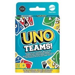 UNO Teams é uma nova maneira de jogar o jogo clássico! Os jogadores ainda combinam cor, número e símbolo, mas em vez de cada um por si, eles se unem em pares e jogam juntos para vencer Cartas e regras especiais ajudam os companheiros de equipe a trabalharem juntos, mas ambos os jogadores devem se livrar de todas as cartas em suas mãos para vencer E lembre-se, quando você (ou seu parceiro) estiver com a última carta, não se esqueça de gritar UNO!