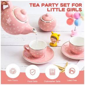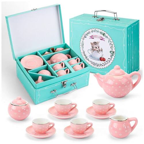 Este conjunto de chá de porcelana é perfeito para meninas que adoram brincar de fingir e deixar a imaginação fluir. Composto por 13 peças, o conjunto possui espaço suficiente para uma festa de 4 pessoas. Cada talher é feito de porcelana genuína, esmaltados à mão em lindos acabamentos rosa, azul, roxo e amarelo com bolinhas brancas. O conjunto inclui 4 pires, 4 xícaras de chá, bule com tampa, creme, açucareiro e um prático estojo de transporte durável e seguro para transportar e armazenar. É uma ótima lembrança para meninas, presente de Dia das Crianças ou de aniversário. Além disso, todas as peças são rigorosamente testadas, 100 BPA e sem grafite, totalmente seguras para uso com comida e bebida de verdade. São fáceis de limpar e podem ser lavadas na máquina de lavar louça. Vale ressaltar que este produto contém pequenos pedaços e deve ser manuseado com cuidado.
