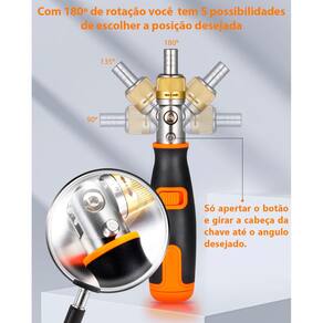Sua cabeça articulada é inclinável, sendo possível movimentá-la em um ângulo de até 180º para cada lado, possibilitando o usuário escolher até 5 posições diferentes. Basta apertar o botão e girar a cabeça da chave no ângulo desejado.