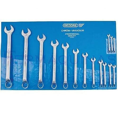 A chave combinada é uma ferramenta recomendada para apertar e afrouxar parafusos e porcas que possuem perfil quadrado ou sextavado. Ela possui dois lados distintos (boca e estrela), e pode ser utilizada para trabalhos em oficinas mecânicas e industriais. É uma ferramenta fundamental em qualquer oficina, marcenaria, entre outros. A chave combinada da marca Gedore é fabricada em aço Gedore-Vanadium e possui acabamento cromado e niquelado..Fornecedor: Gedore.11 peças: 6; 8; 9; 10; 11; 12; 13; 14; 17; 19; 22 mm.Peso: 1,200 kg.Referência: 1 B - 11M.