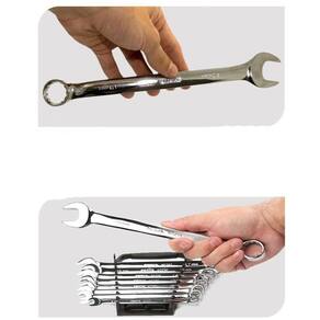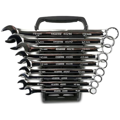 O conjunto é composto por 9 chaves combinadas de diferentes tamanhos, variando de 8 mm a 19 mm, oferecendo uma ampla gama de opções para diversas aplicações. As chaves possuem dois lados, um com uma boca fixa e outro com uma boca ajustável, permitindo que sejam utilizadas em diferentes tipos de porcas e parafusos.