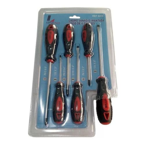 Jogo de chave fenda e phillips 6 pçs lotus plus Jogo chave ph/fenda haste em aço liga cromo vanádio niquelado, injetada diretamente sob a lâmina, ponta imantada e cabo moldado em borracha termoplástica tpr bicolor, com orifício para pendurar, resistente a ácidos, solventes, e a impactos, excelente qualidade para trabalhos profissionais pesados.