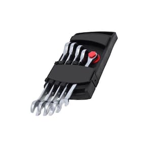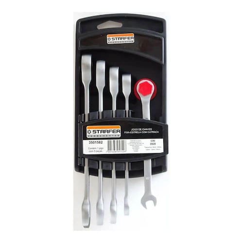 Jogo de chave fixa-estrela com catraca com 5 Peças é ideal pois é muito prática possuindo em uma das extremidades uma boca fixa, e na outra extremidade uma boca estrela. Produto de ótima resistência, fabricada com Aço Carbono Forjado.