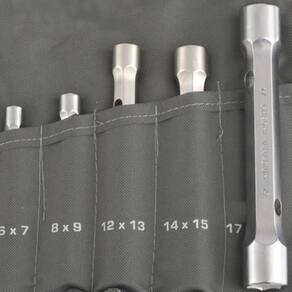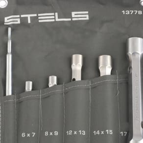 O 1377855 possui 6 peças, composto por 5 chaves tubulares reforçadas com perfil duplo e uma catraca de alta eficiência, com tamanhos mais comumente utilizados: 6x7, 8x9, 12x13, 14x15 e 17x19 mm oferecendo uma solução abrangente para trabalhar com fixadores que exigem aplicação de força significativa.