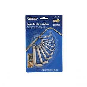 Descricao Antes do uso: Verificar se o produto esta em perfeita condicoes de uso. Perigos: Cuidado durante o manuseio do produto para evitar acidentes. Cuidados: Para reduzir risco de lesoes, sempre use adequadamente equipamentos de protecao individual (oculos de protecao Botas, mascara, luvas etc.) necessarios no trabalho; Use o tipo e tamanho correto de ferramenta para cada tipo de trabalho. Nao force a ferramenta; A ferramenta correta fara o trabalho melhor e mais seguro se utilizada para aquilo que foi projetada; Armazene em local seguro, seco, fresco e longe de umidade; Guarde estas instrucoes para futuras consultas; Manter fora do alcance das criancas. *Imagens meramente ilustrativas. Especificacao Tecnica Contem: 10 Chaves Allen: 1,5mm, 2mm, 2,5mm, 3mm, 4mm, 5mm, 5,5mm, 6mm, 8mm e 10mm Tipo de Embalagem: Blister Dimensoes da Embalagem: 12,5 x 1,6 x 21cm (CxLxA) Quantidade Inner: 25 Pecas Dimensoes Inner: 30 x 14 x 14,5cm (CxLxA) Quantidade Master: 100 Pecas Dimensoes Master: 32,5 x 30 x 30,5cm (CxLxA) Material: Aco carbono Cor: Prata Marca: Western Origem: China