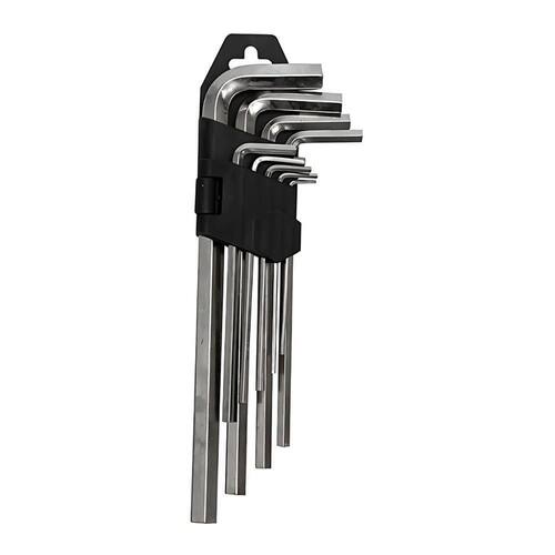 Descricao Jogo De Chaves Allen Extra Longas Com Suporte 1,5 A 10 mm - 9 pecas WesternUma ferramente perfeita para apertar e desapertar parafusos com sextavado interno, forjada com aco cromo vanadio e acabamento cromo acetinado, uma ferramente indispensavel! Oferecemos ferramentas de qualidade que nao podem com toda certeza faltar no seu jogo!- Caracteristicas:Indicada para aperto e desaperto de parafuso, fabricado em aco carbono e acabamento um suporte para organizacao das chaves.*Imagens meramente ilustrativas.Especificacao Tecnica Dimensoes da Peca:1 Chave: 7 x 1,6 x 0,1cm1 Chave: 7,7 x 2 x 0,2cm1 Chave: 8,5 x 2 x 0,2cm1 Chave: 9,7 x 2,2 x 0,3cm1 Chave: 10,7 x 2,7 x 0,4cm1 Chave: 12 x 3,5 x 0,5cm1 Chave: 13 x 3,8 x 0,6cm1 Chave: 15,5 x 4,4 x 0,8cm1 Chave: 17,5 x 4,7 x 1cmMedida com suporte: 18,5 x 6,2 x 2,2cmDimensoes da Embalagem: 10 x 2,5 x 25,5cmQuantidade Inner: 15 PecasDimensoes Inner:30 x 20,5 x 16cmQuantidade Master: 60 PecasDimensoes Master:43,5 x 32 x 33,5cmMaterial: Aco carbono com acabamento niqueladoCor:Chaves:prataSuporte: pretotipo de Embalagem: BlisterMarca: WesternContem:1 Suporte9 ChavesTamanhos:1,5mm2mm2,5mm3mm4mm5mm6mm8mm10mm.