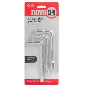 - Marca: Nove54 - Referência: 5436.97.108. - 1 Jogo de chaves biela Tipo L , composto por 3 peças, sendo: 8 mm, 10 mm e 12 mm - Indicado para apertar e soltar porcas e parafusos sextavados principalmente em motos. - Possui corpo com acabamento cromado fosco, proporcionando maior proteção contra oxidação/corrosão, e cabeça com sextavado interno, que facilita o encaixe em locais de difícil acesso. Tipo L - A chave de biela é essencial em todas as oficinas automotivas - É uma chave que tem formato de L e possui duas bocas nas suas extremidades em formato de soquete para aperto e desaperto de porcas - Por ser parecida com uma chave canhão e por ser longa, é utilizada em locais de difícil acesso. - Acompanha resistente bolsa para armazenagem - Garantia: 90 dias
