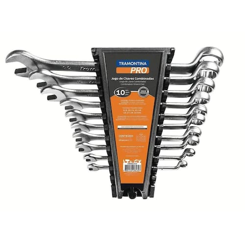 Forjada em aço cromo vanádio e temperada. Cabeça usinada. Pescoço longo. Acabamento cromado. Abertura da boca calibrada. DIN 3113. Suporte plástico. O jogo contém 10 Chaves Combinadas dos seguintes tamanhos: 6, 8, 10, 11, 12, 13, 14, 17, 19, 22.