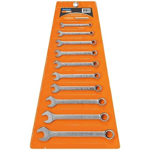Jogo De Chaves Combinadas 10 Peças Tramontina Jogo de chaves combinadas 10 peças Tramontina - Ideal para apertar e afrouxar parafusos ou porcas com perfil quadrado ou sextavado, as chaves da Tramontina PRO são fabricadas com matéria prima que garante alta resistência e durabilidade. Para perfeito funcionamento é importante usar a chave de tamanho à cabeça da porca ou parafuso. Com as chaves da Tramontina PRO, quem passa aperto é o parafuso.OrientaçõesCabeça usinada. Pescoço curto. Acabamento cromado. Abertura da boca calibrada. DIN 3113. ISO 7738. As chaves de aperto são produzidas em aço ligado com cromo vanádio (Cr-V), e apos submetidas a avaliações rigorosas de torque para atender a norma DIN 1711-1. O perfil Hyper Drive, em alguns modelos de boca tipo estrela, reduz a fadiga das chaves, prolongando sua vida útil. A avaliação de dureza é realizada em vários pontos para assegurar a resistência ao desgaste da chave durante o uso ininterrupto. Alguns tipos de chaves de aperto são fornecidos em bitolas métricas e em polegadas, para os diversos fixadores disponíveis. Afrouxar e apertar parafusos e porcas sextavadas e quadradas. As ferramentas são produzidas e testadas conforme normas específicas.ObservaçõesUse óculos, luvas e outros equipamentos de proteção individual (EPIs) de acordo com a tarefa a ser executada. Não golpeie as chaves, a não ser que sejam projetadas para este fim. Sempre utilize uma chave de bitola correta para cada parafuso ou porca para que não haja folga, pois isso danifica a chave e o parafuso. Mantenha a chave limpa para um melhor agarre, pois usá-la suja com graxa ou óleo pode causar acidentes. Não use tubos ou extensões para obter mais torque. Não altere a forma das chaves. Respeite o torque estabelecido por norma para cada tamanho de chaves. Use a chave perpendicular ao eixo do parafuso e/ou porca. Isto aumenta a vida útil da ferramenta e torna a operação mais segura. Armazene em limpo e seco.Características Líquido1,0300 Bruto1,0300 kg.Metragem0,001306 m.Dimensões Embalagem (Compr. X Larg. X 80x 60 ões Produto (Compr. X Larg. X 65x 50 mm. Características Gerais do Produto: Garantia: - 1 Ano