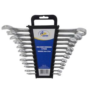 Jogo composto por chaves nos seguintes tamanhos: 7, 8, 9, 10, 11, 12 13, 14, 15, 17, 19 e 22 mm.