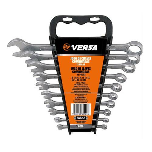 Jogo de chaves combinadas cromo vanadio 12 peças-B670 Jogo de chave combinadas 12 peças de 6mm a 22mm, sendo as medidas 6,7,8,9,10,11,12,13,14,17,19,22mm. Em cromo vanádio Kit de Chave Combinada, fixa e estriada, em aço cromo vanádio - Marca: Versa - Modelo: B670 - Fabricadas em aço cromo vanádio - Kit com 12 chaves combinadas - Medidas: 6, 7, 8, 9, 10, 11, 12, 13, 14, 17, 19 e 22mm - Peso bruto: 980 gramas - : 90 dias