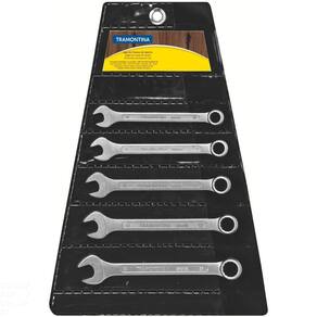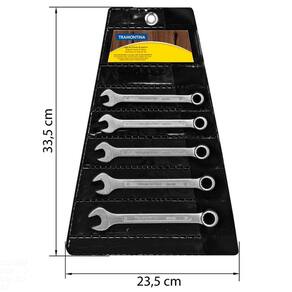 Precisa de um conjunto compacto de chaves combinadas para deixar o seu kit mais completo e pronto para qualquer tarefa? O Jogo de Chaves Combinadas Tramontina Basic com Corpo em Aço Especial Cromado 5 Peças é a escolha perfeita. Um jogo que traz peças produzidas em aço especial cromado, que vão de 10 a 14 milímetros de tamanho e ideais para apertar ou afrouxar parafusos e porcas de perfil quadrado ou sextavado. Com esse jogo, porcas e parafusos nunca mais serão um problema! Orientações Corpo forjado em aço especial e temperado.Acabamento cromado.Abertura das bocas calibradas.Pescoço longo.O teste de dureza é realizado em vários pontos para assegurar a resistência ao desgaste da chave durante o uso ininterrupto. As aberturas das bocas das chaves de aperto são verificadas com gabaritos calibrados, o que garante seu perfeito acoplamento nos parafusos.Alguns tipos de chaves de aperto são fornecidos em bitolas métricas e em polegadas, para o uso nos diversos fixadores disponíveis.As ferramentas são produzidas e testadas conforme normas específicas. Características Gerais EAN13 7891114071887 DUN14 17891114071884 NCM 8204.11.00 Peso Líquido 0,3500 kg. Peso Bruto 0,3500 kg. Metragem 0,000702 m³. Dimensões Embalagem (Compr. X Larg. X Alt.) 195x 90x 40 mm. Observações Use óculos, luvas e outros equipamentos de proteção de acordo com a tarefa a ser executada. Não golpeie as chaves, a não ser que sejam projetadas para este fim. Sempre utilize uma chave de bitola correta para cada parafuso ou porca para que não haja folga, pois isso danifica a chave e o parafuso. Mantenha a chave limpa para um melhor agarre, pois usá-la suja com graxa ou óleo pode causar acidentes. Não use tubos ou extensões para obter mais torque. Não altere a forma original das chaves. Armazene em local limpo e seco.