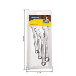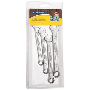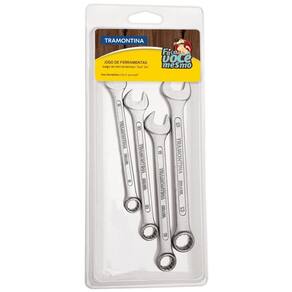 Todo mundo sabe que ter ferramentas que acompanhem o seu ritmo é indispensável! O Jogo de Chaves Combinadas Tramontina com Corpo em Aço Especial Cromado com 4 Peças é assim. Com diferentes tamanhos e combinando duas aberturas diferentes em cada peça, ele vai te permitir exercer toda sua capacidade na hora de reformas e reparos em casa, pois além de versátil, ele é extremamente resistente e durável. Um jogo que é indispensável para você executar suas tarefas da melhor maneira! Orientações Corpo forjado em aço especial e temperado.Acabamento cromado.Abertura das bocas calibradas.O teste de dureza é realizado em vários pontos para assegurar a resistência ao desgaste da chave durante o uso ininterrupto. As aberturas das bocas das chaves de aperto são verificadas com gabaritos calibrados, o que garante seu perfeito acoplamento nos parafusos.Alguns tipos de chaves de aperto são fornecidos em bitolas métricas e em polegadas, para o uso nos diversos fixadores disponíveis.As ferramentas são produzidas e testadas conforme normas específicas. Características Gerais EAN13 7891114077728 DUN14 17891114077725 NCM 8204.11.00 Peso Líquido 0,2000 kg. Peso Bruto 0,2600 kg. Metragem 0,000842 m³. Dimensões Embalagem (Compr. X Larg. X Alt.) 255x 110x 30 mm. Observações Use óculos, luvas e outros equipamentos de proteção de acordo com a tarefa a ser executada. Não golpeie as chaves, a não ser que sejam projetadas para este fim. Sempre utilize uma chave de bitola correta para cada parafuso ou porca para que não haja folga, pois isso danifica a chave e o parafuso. Mantenha a chave limpa para um melhor agarre, pois usá-la suja com graxa ou óleo pode causar acidentes. Não use tubos ou extensões para obter mais torque. Não altere a forma original das chaves. Armazene em local limpo e seco.