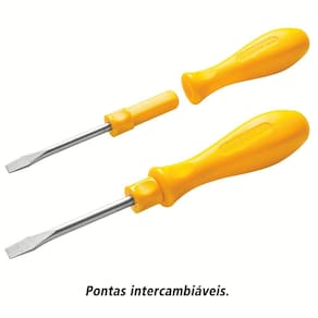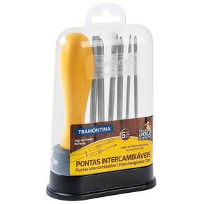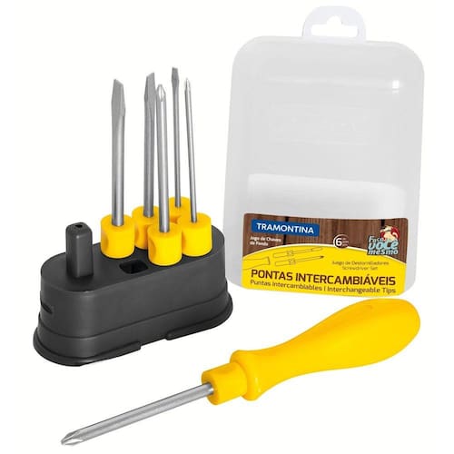Um belo kit de chaves de fenda irá proporcionar muita praticidade para a sua vida, sem dúvidas. Então conheça o Jogo de Chaves de Fenda Tramontina com Pontas Intercambiáveis 6 peças. As pontas intercambiáveis fazem desse conjunto um item perfeito pra você, pois tem peças diversificadas e muito práticas. Além disso, as ferramentas são testadas com rigorosos padrões de qualidade, lhe garantindo durabilidade e resistência. Orientações As hastes das chaves de fenda são testadas em máquinas de ensaio específicas, para verificar o perfeito balanço entre resistência mecânica e dureza.Cabos injetados com material de alta resistência.Os dimensionais das pontas são verificados com gabaritos-padrão, calibrados e certificados.As ferramentas são produzidas e testadas conforme normas específicas.Conteúdo: 3 ponteiras ponta chata: 1/8x3", 3/16x3" e 1/4x3", 3 ponteiras ponta cruzada: 1/8x3", 3/16x3" e 1/4x3", 1 suporte para ponteira. Características Gerais EAN13 7891114088175 DUN14 17891114088172 NCM 8205.40.00 Peso Líquido 0,2200 kg. Peso Bruto 0,2200 kg. Metragem 0,000709 m³. Dimensões Embalagem (Compr. X Larg. X Alt.) 105x 45x 150 mm. Observações Use óculos, luvas e outros equipamentos de proteção individual (EPIs) de acordo com a tarefa a ser executada. Utilize chaves de fenda isoladas, identificadas pela marcação 1.000 V, quando for necessário trabalhar em locais com corrente elétrica. Importante: nestes casos, inspecione a integridade da isolação elétrica, e, se aparecerem trincas na isolação, suspenda o uso imediatamente. Utilize chaves com ponta adequada para cada tipo de fenda, para realizar a tarefa de forma mais rápida e segura. Respeite o torque estabelecido por norma para cada bitola. Não utilize as chaves de fenda como formão ou alavanca. Não altere as dimensões originais da ponta para obter outro perfil. Armazene em local limpo e seco.Respeite sua cidade e o meio ambiente, para descarte dos produtos e embalagens, siga as orientações de reciclagem vigentes.