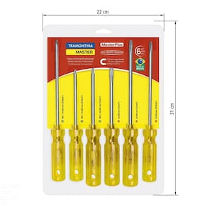 O Jogo de Chaves de Fenda Tramontina Masterplus em Aço Cromo Vanádio 6 Peças é o melhor companheiro para variadas atividades. São seis chaves de fenda que auxiliam em reparos na casa até projetos mais complexos. Nada como ter ferramentas utilitárias dentro de casa! Orientações Haste em aço cromo vanádio temperada. Cabo em PVC amarelo transparente. Acabamento cromado. Ponta magnetizada. DIN ISO 2380 Características Gerais EAN13 7891114153217 DUN14 17891114153214 NCM 8205.40.00 Peso Líquido 0,6000 kg. Peso Bruto 0,6200 kg. Metragem 0,002387 m³. Dimensões Embalagem (Compr. X Larg. X Alt.) 310x 220x 35 mm. Observações Sempre utilizar óculos de segurança para proteger os olhos. Sempre utilizar chaves de fenda isoladas, identificadas pela marcação 1.000 V, quando é necessário trabalhar em um local que tenha corrente elétrica. Utilizar chaves com ponta adequada para cada tipo de fenda, para realizar a tarefa de forma mais rápida e segura. Respeitar o torque estabelecido por norma para cada bitola.