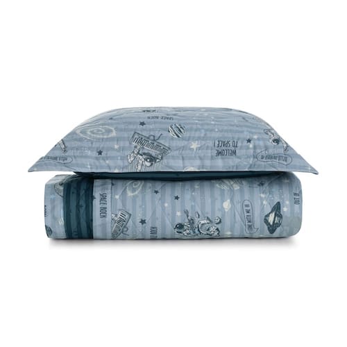 O jogo de colcha Espacial é uma explosão de criatividade e conforto. De um lado, o astronauta rockstar se apresenta em uma cena vibrante no espaço; do outro, uma padronagem listrada com estrelas garante versatilidade para diferentes composições. O porta-travesseiro acompanha o tema, reforçando a unidade visual. Com acabamento em matelassê e enchimento leve, esse conjunto é ideal para deixar o quarto mais lúdico e estiloso, sem abrir mão da praticidade no dia a dia.