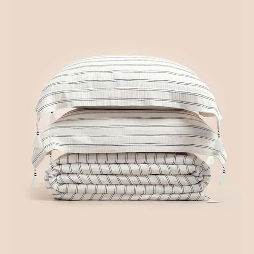 Fibra natural, o algodão é durável, macio e respirável. O tecido absorve o calor do corpo, agindo como um termostato natural, mantendo frescor no verão e proteção ao frio no inverno e as fronhas não irritam a pele mais sensível do rosto. O tecido pré-lavado tem estrutura de gaze em dupla camada que o deixa ainda mais respirável. O aspecto naturalmente enrugado do tecido com detalhes em fio tinto adicionam um estilo delicadamente descontraído e autêntico.