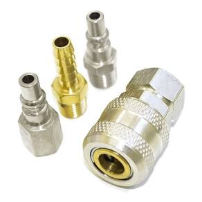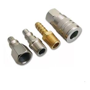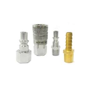 Jogo de Conectores com engate rápido e rosca 1/4 , 4 peças. Itens inclusos: -01un. Engate Fêmea. -01un. Espigão para Mangueira 5/16. -01un. Engate macho rosca externa 1/4. -01un. Engate macho rosca interna 1/4.