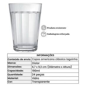 Esse belíssimo Jogo de copos Americano em vidro 24 peças 190ml Transparente é muito utilizado nas casas e nos comércios como padarias, bares, lanchonetes e botecos, é um modelo de copo super versátil pois consegue atender a vários públicos desde o tradicional café matinal ou tomar aquela cerveja ou cachacinha.Como americano também é utilizado pelas donas de casa como medidor de receitas para bolo, torta entre outros.Itens inclusos; 24 copos americano lagoinha de vidro clássico 190ml TransparenteInformações Importantes;Medidas aproximadas - 6,7 x 9,3cm Diâmetro x Altura Capacidade - 190mlComposição - VidroCor - TransparenteValidade - IndeterminadaConteúdo do envio - 1 unidade do Jogo de copos Americano em vidro 24 peças 190ml TransparenteFabricante - Nadir FigueiredoProduto 100% nacionalMais Informações;Evite pancadas ou impactos pois podem trincar, lascar ou danificar o produto.Pode ser lavado em lava louças.Ao lavar use de preferência detergente neutro, esponja macia e enxague com água em abundância. Jogo de copos Americano em vidro 24 peças 190ml Transparente