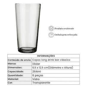 Esse belíssimo Jogo de copos em vidro long drink 6 peças 264ml Transparente, vai super bem com qualquer tipo de decoração graças ao seu aspecto clássico, que combina com tudo, vai ornar perfeitamente com os demais utensílios que você tem. Ele vai ser perfeito para usar no dia a dia ou quando for receber as visitas em casa. Fabricado em vidro de qualidade esse copo apresenta uma excelente resistência. Itens inclusos; 6 copos long drink bar 264ml clássico em vidro Transparente Informações Importantes; Medidas aproximadas - 6,5 x 12,5cm Diâmetro x Altura Capacidade - 264ml Composição - Vidro Validade - Indeterminada Fabricante - Nadir Figueiredo Conteúdo do envio - 1 unidade do Jogo de copos em vidro long drink 6 peças 264ml Transparente Produto 100% nacional Mais informações; Evite pancadas ou impactos pois podem trincar, lascar ou danificar o produto. Pode ser lavado em lava louças. Ao lavar use de preferência detergente neutro, esponja macia e enxague com água em abundância. Jogo de copos em vidro long drink 6 peças 264ml Transparente Marca: Não Informado Ean: 7898708054301