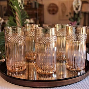 O copo alto Palace é produzido em vidro de qualidade, sua parte superior é decorada com um entalhe preciso com decorações geométricas que remetem ao início do século XX, e adicionam um toque retro agradável ao serviço. O tom Âmbar trás mais requinte a peça.