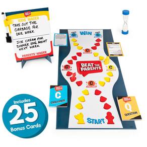 Jogo clássico de curiosidades para a família Beat The Parents, com 25 cartões de bônus para crianças a partir de 6 anos (exclusivo da Amazon) - Quem governa a casa? Em Beat the Parents, são crianças versus pais em um confronto divertido e cheio de ação de curiosidades e desafios. Há uma aposta em jogo – seu time será campeão na noite de jogos em família? - Escolha uma aposta – O que você fará? Cada time escreve uma aposta antes do início do jogo. O que você fará se perder? Retirar o lixo? Compre pizza para todos? As apostas nunca foram tão altas - TRÍVIA AMIGÁVEL PARA CRIANÇAS COM 25 CARTÕES DE BÔNUS: Crianças e pais vivem em mundos diferentes, então cada geração recebe seu próprio conjunto de perguntas. Pais, você sabe o que seus filhos sabem? Crianças, quão inteligentes são seus pais? Para 2 a 6 jogadores, a partir de 6 anos - SPIN MASTER GAMES: Procurando jogos para a noite de jogos em família? Nossos brinquedos e jogos oferecem uma variedade de jogos infantis a jogos de tabuleiro para adultos, quebra-cabeças para adultos e crianças e jogos ao ar livre - Jogos de tabuleiro para a noite em família: mude com jogos de quintal, jogos de festa e jogos para casais. Não se esqueça de quebra-cabeças de 1000 peças para adultos e jogos de cartas para adultos também, além de jogos de tabuleiro para crianças de 8 a 12 anos e jogos para crianças de 4 a 8 anos - Inclui 200 cartas de perguntas e desafios, 1 tabuleiro de jogo, 1 temporizador de areia, 2 jogadores, 1 marcador apagável a seco com clipe, 1 tabuleiro de apostas com suporte, 25 cartas de bônus e instruções (sem garantia de versão em português) - Coberto pelo compromisso Spin Master Care. Veja abaixo os detalhes completos