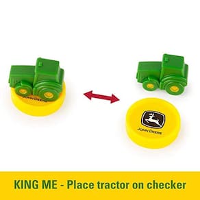 O clássico jogo de damas atende a diversão agrícola de John Deere! A placa especialmente projetada inclui damas verdes e amarelas, cada uma com um autêntico logotipo John Deere. Melhor ainda, este grande jogo para crianças e adultos leva "King Me" a um novo nível. Cada jogador tem 4 tratores para colocar em cima do verificador quando é hora de "Trator Me"! Então volte a andar pelo tabuleiro e assuma o controle do campo!