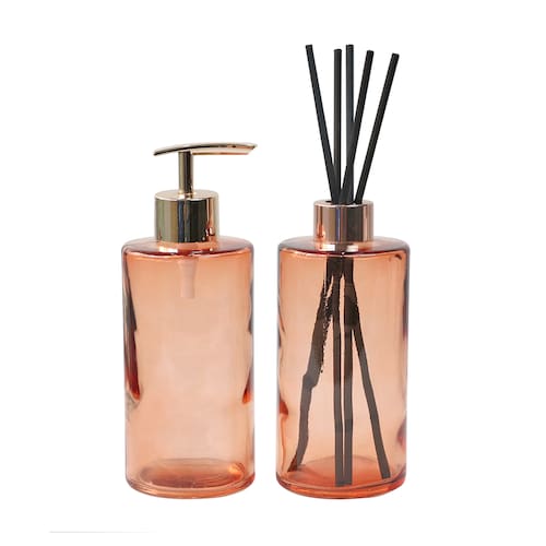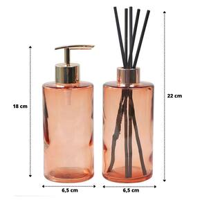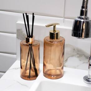 O Kit Frasco Difusor com Porta Sabonete Líquido é a combinação perfeita de estilo e funcionalidade. Composto por um frasco difusor com 5 varetas e um porta sabonete líquido, ambos com design em vidro e detalhes elegantes. O pump dourado do porta sabonete líquido e a tampa do difusor em gold rose acrescentam sofisticação ao ambiente, tornando o kit ideal para decorar banheiros ou lavabos.