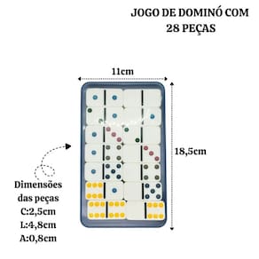 Este conjunto vem com 28 peças feitas em plástico resistente, com espessura de 10mm, proporcionando durabilidade e conforto ao manusear. Acompanha uma prática lata metálica para armazenar e transportar com facilidade, mantendo as peças organizadas e protegidas. Perfeito para momentos em família, jogos com amigos ou como opção educativa para crianças desenvolverem o raciocínio lógico.