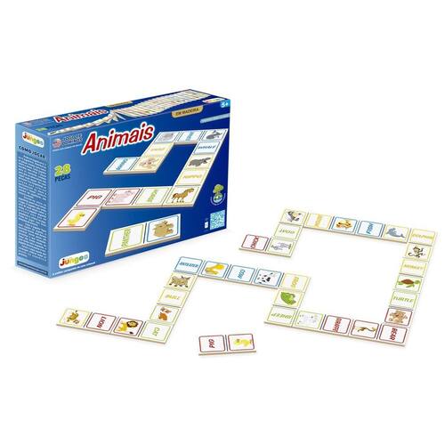 Jogo Dominó da Junges com 28 peças de 3,5x7cm cada, em madeira de reflorestamento (MDF). Impressão direto na madeira com acabamento de alta qualidade, durabilidade e resistência. Com o jogo de dominó as brincadeiras se tornam educativas e divertidas! Ideal para aprimorar o raciocínio lógico, concentração e atenção. Embalagem: caixa litografada com regras básicas
