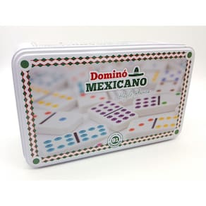 Jogo de Dominó Trem Mexicano 91 PedrasO jogo de dominó trem mexicano pode ser jogado em grupos de quatro a dez jogadores. Ele possui as mesmas regras básicas que a maioria dos jogos de dominó, com as pedras sendo posicionadas ponta a ponta com as metades iguais se tocando.O jogo de dominó mexicano é emocionante, divertido, desenvolve o raciocínio e aproxima as pessoas. Lindo para presentear a um amigo ou a si mesmo.Descrição:Acompanha uma linda lata para guardarPedras: 91Cor das pedras: BrancaCamada de proteção antirriscoMedidas Pedras: Altura: 5,2 centímetros Largura: 2,5 centímetrosEspessura: 0,70 centímetrosMedidas Lata em centímetros: 7,5 altura, 11,5 largura e 19 comprimento Composição: Metal e resinaAcompanha Manual de instruções4 Marcadores modelo trem Ean: 7897262428856