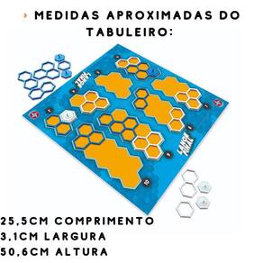 Contém na embalagem: 01 tabuleiro, 06 marcadores azuis, 06 marcadores brancos, 2 conjuntos de peças nas cores azul e branco, com 13 peças cada, nos seguintes formatos: 5 simples; 4 duplas; 3 triplas; 1 quádrupla.