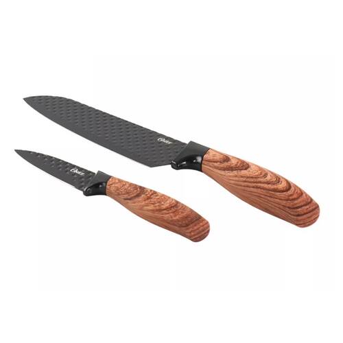 Corte e corte em cubos com este conjunto de talheres de aço inoxidável preto de 2 peças Oster Gunderson. O conjunto inclui uma faca santoku de 6,5 e uma faca de descascar de 3,5. Ambos apresentam lâminas de aço inoxidável duráveis ??para um corte nítido e tecnologia antiaderente texturizada que evita a ferrugem e promove fácil liberação de alimentos. Recomenda-se lavar as peças à mão para que possam permanecer em perfeitas condições por muitos anos. Qualquer um pode ser um chef cinco estrelas com este fantástico conjunto de facas!