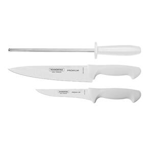 Pegador / Cabo: Polipropileno;Dimensões AxLxP (mm): 38x16x27;Cor: Aço Inox e Branco;Material: Aço Inox e Polipropileno;Garantia: 90 dias junto ao fabricante;Referência: 24499812;Tratamento do Talher: Tratamento Térmico;Itens Inclusos:1 Chaira 8 Premium;1 Faca Utility 8 Premium;1 Faca para Desossar 5 Premium;
