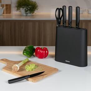 ESPECIFICAÇÕES TÉCNICAS: o Conjunto de Facas 6 Peças c/ Cepo Action Brinox é composto por: 1 Faca do Chef 8 polegadas 33 x 4 x 1,8 cm; 1 Faca para Pão 8 polegadas 33,5 x 3,2 x 1,8 cm; 1 Faca para Cozinha 8 polegadas 33,5 x 3,2 x 1,8 cm; 1 Faca para Legumes 3,5 polegadas 20,6 x 2,4 x 1,8 cm; 1 Tesoura 20,8 x 8,3 x 1,4 cm; e 1 Suporte - 23 x 7,8 x 22,8 cm. As lâminas das facas são em aço inoxidável e os cabos em ABS na cor Preto. O suporte, com acabamento soft-touch, e o cabo da tesoura são em polipropileno.