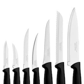 Tratamento do Talher: Tratamento Térmico;Cor: Aço Inox e Preto;Material: Aço Inox e Polipropileno;Garantia: 90 dias junto ao fabricante;Referência: 23498066;Pode ir à Maquina de Lavar Louças? SimItens Inclusos1 Faca para Churrasco / Frutas 5;1 Faca para Tornear 3;1 Faca para Legumes / Frutas 3;1 Faca para Pão 7;1 Faca para Desossar 5;1 Faca Chef 7;1 Faca para Tomate 4