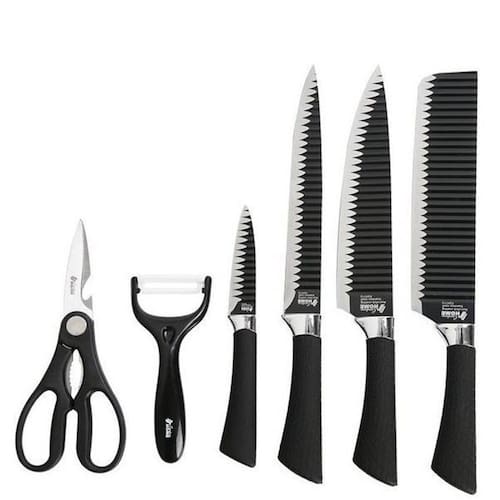 O kit conta com 6 facas: cutelo, do chef, pontuda, pequena de serviço, tesoura e descascador de legumes. Cada faca possui um formato e tamanho específicos, permitindo que você escolha a ideal para cada tipo de alimento. Com isso, você terá mais precisão e facilidade na hora de cozinhar.