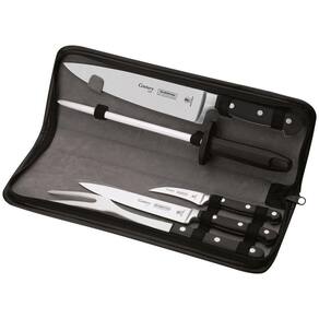 As lâminas forjadas de aço inox especial garantem um fio com maior durabilidade e precisão. As lâminas possuem tratamento térmico diferenciado, composto por têmpera, sub-zero e revenimento. E contam com dureza da lâmina de 55 e 58 HRC, que garante maior resistência do fio e precisão no corte. Os cabos de policarbonato reforçado com fibra de vidro garante alta durabilidade, equilíbrio e segurança. Garfo trinchante com lâmina de aço inox e cabo de polipropileno. Chaira com haste de aço inox especial garante um com maior durabilidade, precisão para a afiação e cabo de polipropileno garante alta durabilidade, equilíbrio e segurança. O cabo ergonômico proporciona maior segurança, equilíbrio e conforto. Estojo sintético que oferece uma proteção as peças, permitindo o transporte e armazenagem com maior segurança. Podem ir à máquina de lavar louças facilitando seu dia a dia.