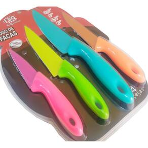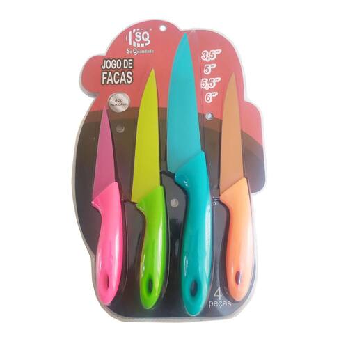 Jogo De Facas Colorida Em Aço Inox Cozinha Churrasco Legumes Jogo de Facas 4 Peças em Aço Inox Coloridas, produto de alta qualidade, e design moderno. Características: Cabo Plástico. Faca em aço inoxidável. Medidas: 3,5, 5, 5,5, 6. Marca: SQ Ref: SQ-3897 Ean: 7899441528500