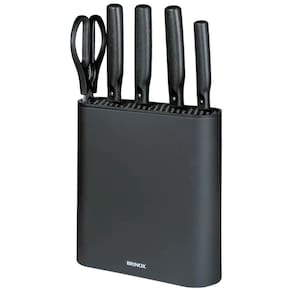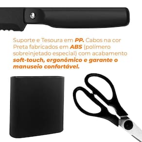 O kit possui suporte em polipropileno com acabamento siliconado soft-touch na cor preto fosco para você manter suas facas sempre organizadas.